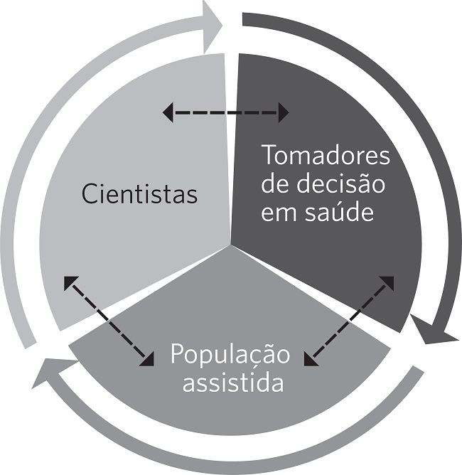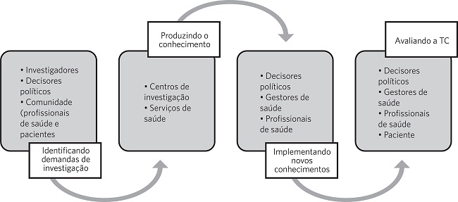 Para transpor essa lacuna entre pesquisadores e público beneficiário da pesquisa, acredita-se que a pesquisa participativa seja um caminho/alternativa. O avanço da ciência da TC exigirá necessariamente que os mundos da prática e da pesquisa sejam aproximados37, porque a pesquisa que tem metas transformadoras precisa ser fundamentada no aqui e agora39. No entanto, para isso, faz-se necessário haver o diálogo e o engajamento da parte dos cinco principais setores da sociedade, a saber: organizações de saúde, instituições acadêmicas, centros de pesquisa, organizações governamentais e a comunidade, para garantir que haja alinhamento da atividade de cada um desses grupos (Pesquisa, Educação, Saúde, Governo, Comunidade, [incluindo Indústria]) com o objetivo comum de TC42.