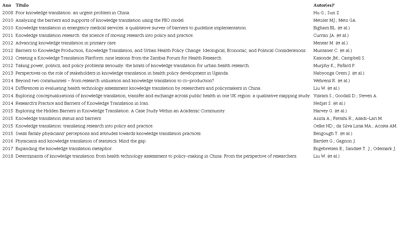 Constatou-se, nos estudos analisados (quadro 1), que a TC tem diversos desafios a serem superados, os quais foram sintetizados nesta revisão de escopo em duas grandes categorias: Falta de coesão entre a comunidade científica e os tomadores de decisão em saúde; Deficiência de habilidades e recursos para a Tradução conhecimento.