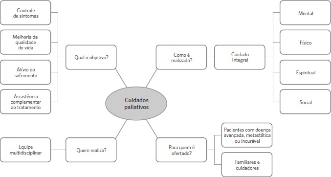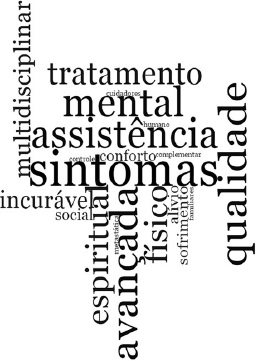 A figura 1 mostra que as palavras com maior destaque na descrição do significado de cuidados paliativos remetem à característica multidisciplinar e holística do cuidado, voltado para doença avançada ou incurável, com o objetivo de melhorar a qualidade de vida e aliviar os sintomas. O mapa conceitual (figura 2) organiza e sintetiza essas características a partir dos significados relacionados ao objetivo do cuidado, ao agente do cuidado, como o cuidado se realiza e para quem.