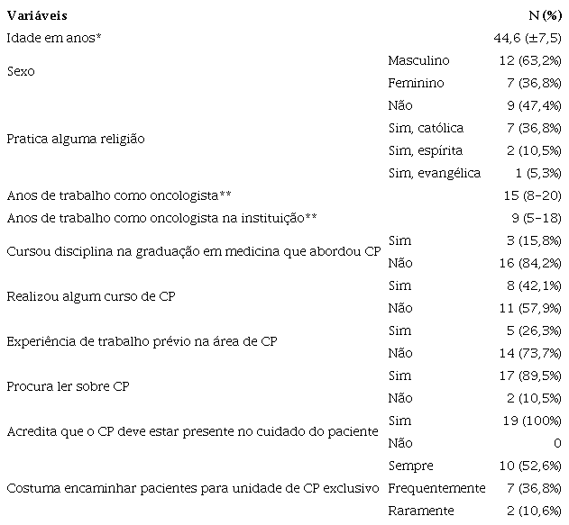 Os participantes preencheram um formulário semiestruturado, construído após revisão bibliográfica em bases indexadas8, 9, 10, 11, 12, 13. Realizouse o pré-teste do formulário com um médico oncologista que não participou das demais fases do estudo. Obtiveram-se, por meio de perguntas fechadas, informações sociodemográficas acerca de idade, sexo e religião; sobre a formação do oncologista e tempo de prática na especialidade; relacionadas ao conhecimento, experiência e interesse sobre o tema de cuidados paliativos; bem como inerentes ao encaminhamento de pacientes para a UCP. No questionário, havia também duas questões abertas sobre ‘O que significa cuidado paliativo?’ e ‘Qual o benefício em encaminhar seu paciente para o cuidado paliativo exclusivo?’.