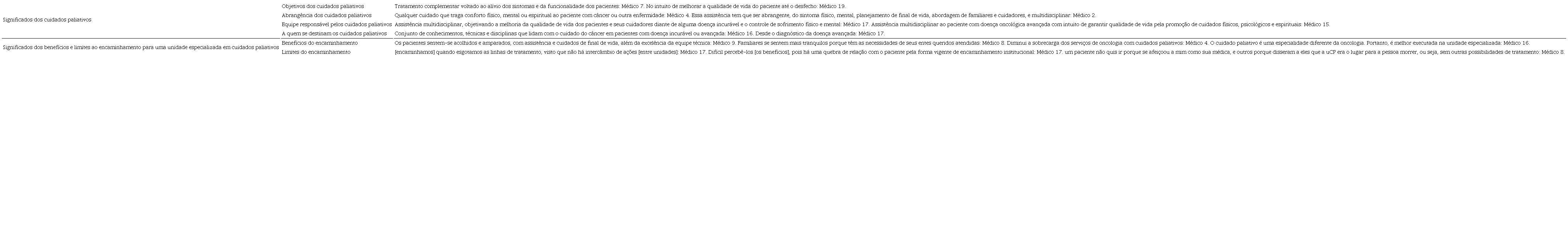 O quadro 1 exemplifica recortes com algumas das falas dos participantes em relação a esses significados, bem como aos benefícios e limites ao encaminhamento para uma unidade especializada em cuidados paliativos. Esses sentidos, relacionados aos benefícios do encaminhamento à UCP, incluíram o acolhimento especializado e qualificado, que é extensivo não apenas ao paciente como também a seus familiares e cuidadores. Como benefícios indiretos, foi destacada a redução na demanda assistencial das unidades voltadas ao tratamento curativo do câncer. Um entrevistado reconhece o cuidado paliativo como uma especialidade diferente da oncologia, destacando os benefícios do encaminhamento a uma unidade que oferece cuidado paliativo diferenciado daquele que o paciente obteria em uma unidade de tratamento curativo para o câncer.