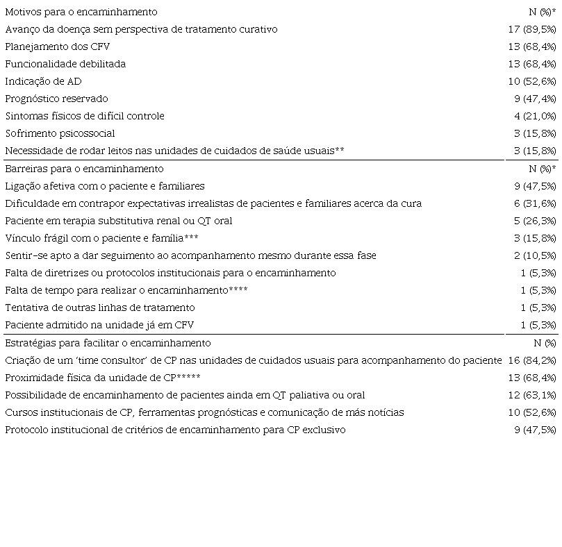 Os quatro principais motivos para a deliberação de cuidados paliativos exclusivos na prática clínica dos entrevistados foram o avanço da doença sem perspectiva de tratamento curativo (89,5%), o planejamento dos cuidados de fim de vida (68,4%), a redução da funcionalidade (68,4%) ou a demanda por assistência domiciliar (52,6%), modalidade de atendimento que, na instituição em questão, só existe na UCP. Como barreiras enfrentadas pelos médicos para esse encaminhamento, destacaram-se a ligação afetiva com os pacientes e familiares (47,5%), a dificuldade em contrapor expectativas irrealistas dos pacientes acerca da cura (31,6%) e o fato de o paciente estar em terapia substitutiva renal ou quimioterapia oral (26,3%) (tabela 2).