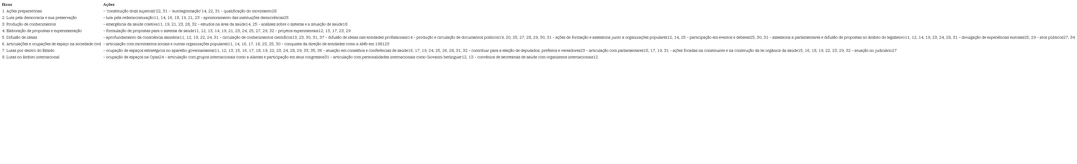 Conforme observa-se no quadro 2, as ações receberam atenção diferenciada por parte dos autores, e algumas delas aparecem nos artigos sem afirmações claras de que teriam sido desencadeadas pelo ‘movimento sanitário’. Contudo, como apontado no item anterior, pelo fato de existirem divergências sobre quem compõe o movimento, optamos por também citá-las.