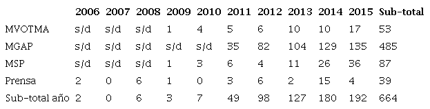 II) Fuentes que aportan información complementaria respecto de las intoxicaciones por plaguicidas agrícolas y otros problemas de salud ambiental vinculados a su uso: a) Se realizó un relevamiento sistemático de las noticias relacionadas con el uso de plaguicidas agrícolas en dos medios de prensa escritos de alcance nacional para el período 2006-2015, donde se ficharon un total de 30 artículos y en los que se reportaban, en algunos casos, problemas de afectaciones a la salud y el ambiente. b) Se relevó información sobre denuncias realizadas ante organismos del estado por problemas vinculados al uso de plaguicidas agrícolas. En Uruguay existen distintos organismos estatales involucrados en la regulación de los plaguicidas, controlando, entre otros aspectos, las composiciones y etiquetas de los productos, las tecnologías y distancias de aplicación respecto de centros poblados, instituciones educativas y cursos de agua, entre otros39,40. Para este estudio, se solicitó y obtuvo mediante ley de acceso a la información pública (Ley N.º 18381) datos sobre denuncias por problemas con plaguicidas presentadas ante: la División de Salud Ambiental y Ocupacional del Ministerio de Salud Pública (MSP), la Dirección Nacional de Medio Ambiente (Dinama) del Ministerio de Vivienda, Ordenamiento Territorial y Medio Ambiente (MVOTMA) y la Dirección Nacional de Servicios Agrícolas del Ministerio de Ganadería, Agricultura y Pesca (MGAP). Se seleccionaron estos tres organismos debido a que tanto en la bibliografía, como en las entrevistas realizadas a expertos sobre salud ambiental nacional, emergieron como los más significativos. Las características, calidad y período de la información obtenida varió en cada institución de acuerdo a su disponibilidad, por ejemplo mientras el MVOTMA y el MSP aportaron registros de denuncias a partir del año 2009, el MGAP lo hace recién a partir de 2011. Es importante precisar que sólo se contó con la información de la denuncia efectuada, es decir, de los registros que las instituciones realizaron a partir de los datos proporcionados por el denunciante. No se contó con información sistematizada de resultados de las actuaciones oficiales ante las mismas.