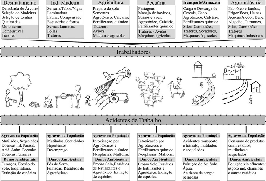 A análise integrada em saúde-trabalho-ambiente feita por Pignati1 traz uma exposição clara do que está por trás do agronegócio como mostra a figura 1 , que evidencia os impactos na saúde dos trabalhadores, agravos na população e danos ambientais em todos os elos dessa cadeia produtiva.