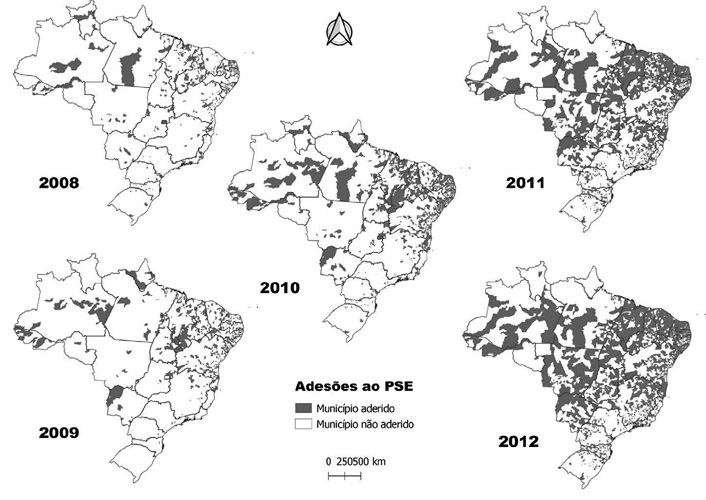 Desde o lançamento do PSE, o Programa é pactuado voluntariamente pelos municípios por meio de adesão realizada pelos Secretários Municipais de Saúde e de Educação, conforme regras de participação variadas definidas ao longo dos anos. Em 2008, o PSE foi implantado em um número reduzido de municípios que manifestaram a intenção de participar do Programa, segundo critérios que inicialmente tinham por base o perfil de vulnerabilidade dos estudantes da rede pública de ensino. Esses critérios foram gradativamente modificados e expandidos para o Programa compreender números maiores de municípios. Dessa forma, em 2008 cerca de 11% dos municípios brasileiros participavam do PSE, enquanto, em cinco anos, esse percentual chegou a 44,8% do País. A figura 1 demonstra a distribuição dos municípios participantes do PSE ao longo dos anos, com concentração inicial predominante nas regiões Norte, Nordeste e Centro-Oeste.