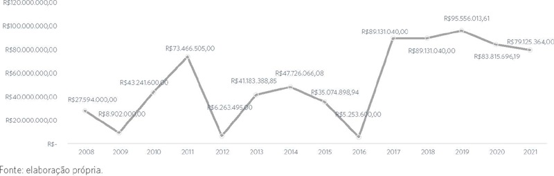 O atual incentivo financeiro está expresso na Portaria Interministerial nº 1.055, de 25 de abril de 2017, cujo valor corresponde a R$ 5.676,00 para o intervalo de 1 a 600 estudantes e o acréscimo de R$ 1 mil a cada intervalo de 1 a 800 que supere 600 estudantes, repassado na adesão. Além disso, o repasse referente ao monitoramento condicionado ao cumprimento das metas monitoradas, tendo como base o mesmo valor repassado na adesão7,14. O histórico de repasses até 2021 está representado no gráfico 1, que representa essa variação dos repasses, entre valores correspondentes à adesão e ao cumprimento das metas pactuadas. Atualmente esse montante corresponde a cerca de 89 milhões de reais anuais. Com isso, de 2008 a 2021, foram repassados aos municípios mais de R$ 725 milhões de recurso ordinário do PSE.