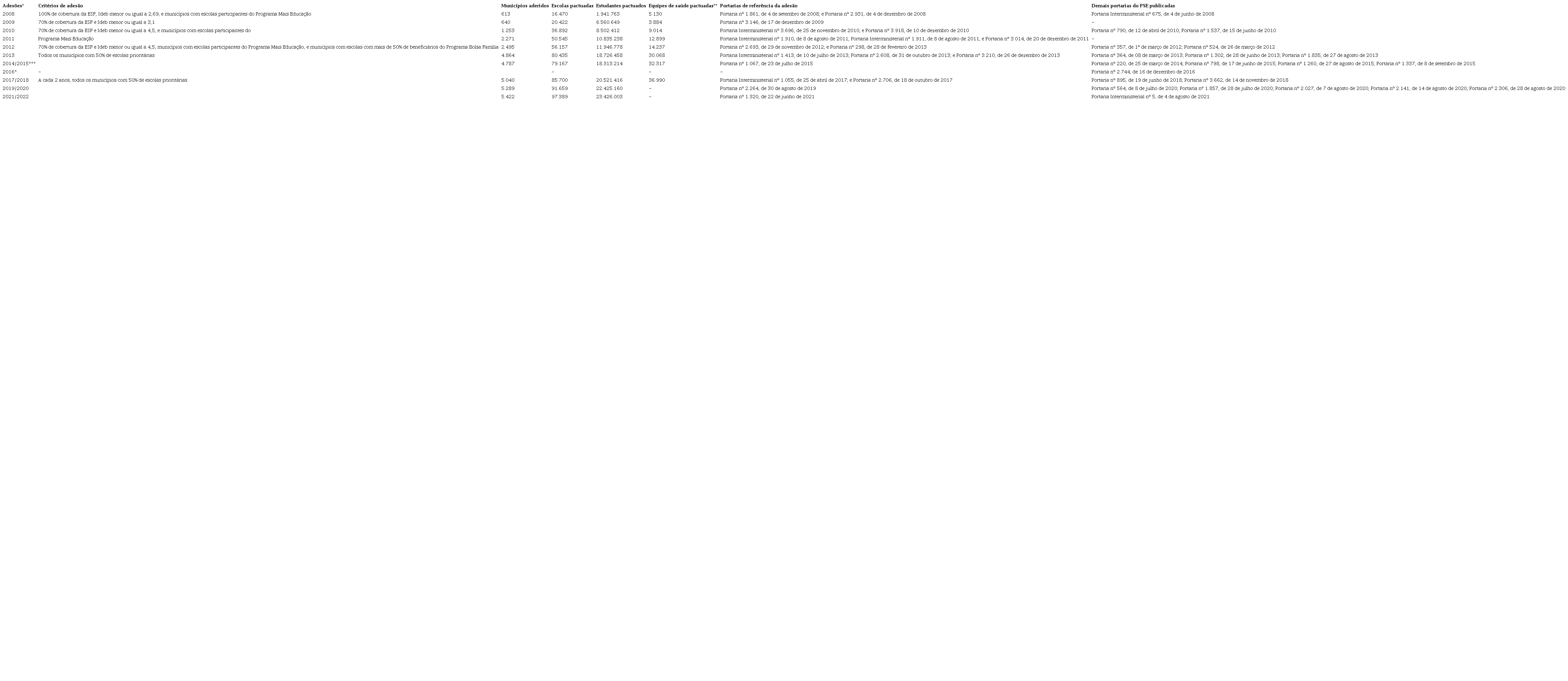 Nas adesões de 2013 e 2014/2015, pelo menos 50% do total de estabelecimentos de educação selecionados para participar do Programa deveriam ter as seguintes características para serem considerados escolas prioritárias: creches públicas ou conveniadas; escolas do campo; escolas participantes do PSE no ano anterior; escolas participantes do Programa Mais Educação no ano anterior; escolas que tiveram, no ano anterior, adolescentes matriculados em cumprimento de medidas socioeducativas; escolas que tenham pelo menos 50% dos educandos matriculados pertencentes a famílias beneficiárias do Programa Bolsa Família. A partir de 2017, esses critérios continuam vigentes para a adesão, exceto os critérios da pactuação prévia e participação do Programa Mais Educação. Esses critérios de vulnerabilidade, acrescidos do aumento da adesão dos municípios ao longo do tempo, permitiram a pactuação de mais de 97 mil escolas e 23 milhões de estudantes na adesão de 2021/2022, o maior resultado do período (quadro 1).