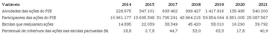 Ressalta-se que, para as atividades e participantes das ações do PSE de 2008 a 2013, não foi possível extrair os dados dos sistemas de informação do MS e do MEC devido à ausência ou à falta de comparação de informações.