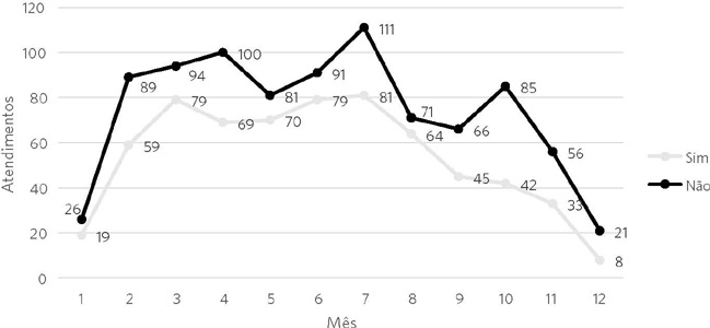 Considerando-se o mês de atendimento, em todo o período analisado, observa-se uma tendência de crescimento até meados do ano e decréscimo no período que segue, apesar do aumento verificado no mês de outubro. Quanto às prescrições, constata-se a mesma tendência crescente nos meses que coincidem com o início do período escolar, retraindo-se após o mês de julho ( gráfico 1).