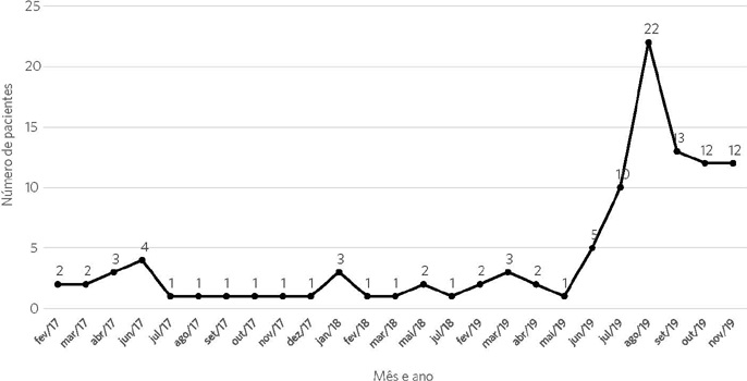 Foram realizados 1.539 atendimentos no ambulatório de neuropediatria do município para todas as faixas etárias. Na distribuição por ano, observa-se que: em 2017, realizaram-se 601 consultas, e, em 220 casos (36,06%), houve prescrição de metilfenidato; em 2018, para 360 consultas, em 160 casos (44,4%); em 2019, para 578 consultas, em 268 casos (46,2%).