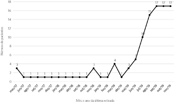 Conforme dados apresentados nos gráficos 2 e 3, é perceptível a proporcionalidade entre a permanência do acompanhamento no ambulatório e a persistência da retirada de metilfenidato. No entanto, 8,41% dos pacientes, que, em algum momento, já deram entrada no ambulatório de neuropediatria, continuam a receber a medicação por meio de outro serviço de saúde pública do município. Desde que adequada ao quadro clínico do paciente, a renovação de receitas favorece a longitudinalidade do tratamento 43.