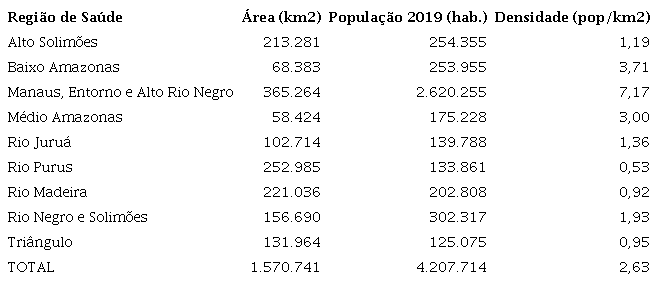 A configuração do estado em relação à saúde é dividida em nove Regiões de Saúde (RS), segundo o Plano Estadual de Saúde do Amazonas (PES/AM) 2020/202337 e a tabela 1.