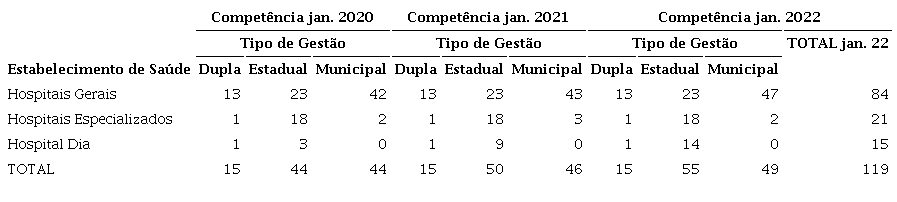 Verificou-se que não houve mudanças expressivas no quantitativo de hospitais entre os períodos investigados: jan./2020 – 103 hospitais; jan./2021 – 111; jan. 2022 – 119, exibindo um aumento de 16 estabelecimentos de saúde. Porém, desses, 11 são hospitais/dia e somente 5 são hospitais gerais, representando um aumento de 4,8% nos hospitais gerais no período estudado, sendo que todos os 15 hospitais/dia estão localizados na capital e são, em sua maioria, hospitais oftalmológicos. Na competência de jan./2021, observou-se a presença de dois hospitais voltados para o atendimento de pacientes com Covid-19: Hospital de Campanha Covid em Caapiranga (cadastrado em 27/06/2020 – gestão municipal) e Hospital de Combate à Covid em Manaus (cadastrado em 05/05/2020 – gestão estadual), além do acréscimo de um hospital geral – Hospital de Maués D. Mundiquinha em Maués (gestão municipal). Quanto à competência de jan./2022, os dois hospitais de atendimento à Covid não estavam mais cadastrados no CNES (a última competência em que eles aparecem foi em 10/2021), mas houve o acréscimo de 2 hospitais e de 2 unidades hospitalares: Hospital D. Edith Mendes Weckner – em Novo Aripuanã (gestão municipal); Hospital Raimundo Rodrigues Irmão – em Manaquiri (gestão municipal); Unidade Hospitalar Barreirinha (gestão municipal); e Unidade Hospitalar Careiro da Várzea (gestão municipal).
