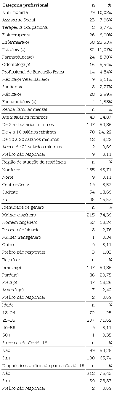 Observou-se que 74,39% (215) das(os) residentes se identificaram como mulher cisgênero, com faixa etária entre 25 e 39 anos (71,62%, 207), e 50,86% (147) se autodeclararam como brancas(os) no quesito raça/cor. Em relação à renda familiar mensal, 50,86% (147) das(os) participantes indicaram ser de 2 a 4 salários mínimos (considerando R$ 1.087,84 como valor base). Dentre as categorias profissionais da saúde, destacou-se a categoria de enfermagem com 23,53% (68) das(os) participantes. De maneira geral, o perfil encontrado se assemelha aos encontrados em outros estudos no campo das residências em saúde, com destaque para os programas multiprofissionais16,17,18.