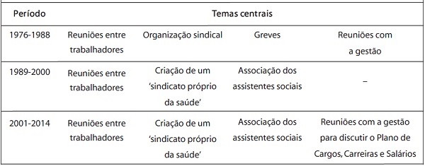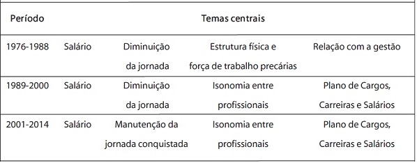 Com base na análise da construção da pauta de reivindicações dos trabalhadores da saúde no período, pode-se inferir que em cada período histórico, além de emergirem novos problemas, reaparecem os velhos insuficientemente resolvidos, como o caso da jornada de trabalho, por exemplo, presente nos anos 1990 como uma reivindicação e na década de 2000 como a defesa de uma conquista a ser mantida.