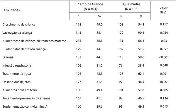 A Tabela 1 mostra que as respostas apresentadas pelas mulheres em relação às atividades educativas desenvolvidas pelos agentes apresentam diferenças, com maior frequência para muitas delas entre os ACSs do município de Queimadas. A vacinação da criança resultou a atividade educativa mais realizada nos dois municípios, sem diferença entre os mesmos, e as atividades relacionadas com o crescimento, cuidado dos dentes, consumo de alimentos ricos em ferro e tratamento/prevenção da anemia nas crianças mostraram proporções baixas, sem diferença importante ao comparar as respostas em Queimadas e Campina Grande.