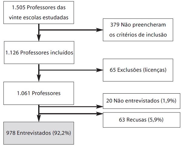 Nas escolas estaduais pesquisadas atuavam 1.505 professores. Desses, 379 foram excluídos por não preencherem os critérios de inclusão. Entre os 1.126 professores incluídos, 65 foram excluídos por estarem de licença e não retornarem em até trinta dias após a saída da equipe de coleta do colégio. A população de estudo foi de 1.061 professores, dos quais 83 foram considerados perdas, tanto pelo insucesso no contato para agendamento da entrevista após cinco tentativas (1,9%) quanto por recusas (5,9%). Ao final, 978 (92,2%) professores foram entrevistados (Figura 1).