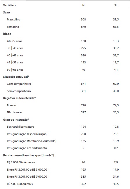 Dos professores entrevistados, a maioria era do sexo feminino (68,5%), de cor branca (74,5%) e com média de idade de 41,5 anos (DP 10). Quanto à situação conjugal, 60% viviam com companheiro. Já a renda familiar aproximada ficou na faixa de R$ 5.001,00 ou mais (40,5%). Dos entrevistados, 73,1% possuíam pós-graduação lato sensu (especialização) (Tabela 1).