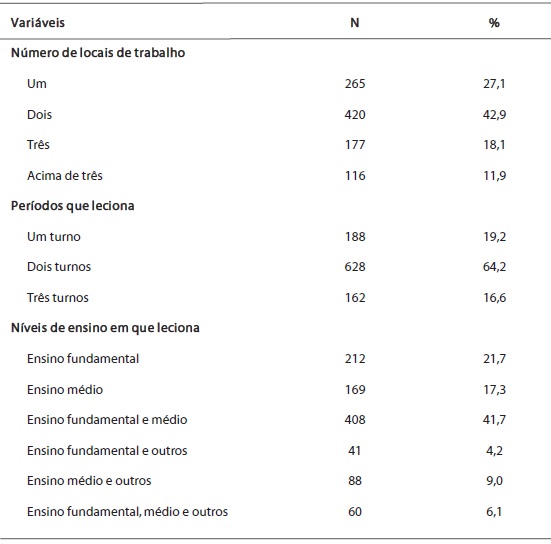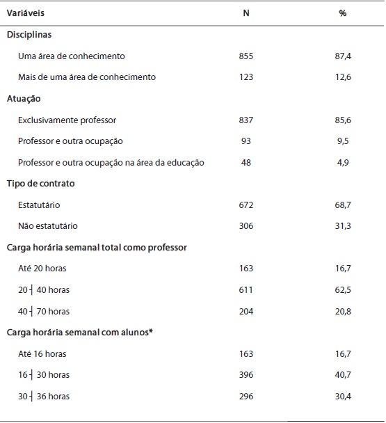 Quanto às características profissionais, verificou-se elevada carga horária semanal como professor. A maior parte dos docentes atuava em até dois locais de trabalho, lecionava tanto no ensino fundamental quanto no ensino médio, e a maioria trabalhava em pelo menos dois turnos. Destaca-se que 12,6% dos professores ministravam disciplinas em mais de uma área de conhecimento, ou seja, enquanto em uma turma ensinava disciplinas da área de humanas, em outra ensinava disciplinas da área de exatas, por exemplo. Além disso, 9,5% dos professores exerciam outras atividades remuneradas além da docência.