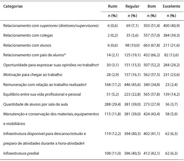 Em relação às condições de trabalho (Tabela 3), 92,3% dos professores relataram ter bom/excelente relacionamento com os superiores, 96,3% afirmaram que o relacionamento com os colegas também era bom/excelente, assim como o relacionamento com os alunos (89,4%) foi considerado positivo. Quanto ao relacionamento com os pais de alunos, entre os que relataram possuir tal relacionamento, 78,8% disseram ser bom/excelente. Porém, 33,2% dos professores referiram que o contato com os pais dos alunos inexistia.