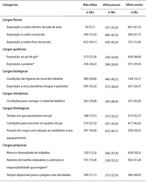 As cargas biológicas – condições de higiene (45,5%) e exposição a microrganismos em ambientes fechados, como banheiros e salas de aula (38,0%) – e a carga mecânica – condições para carregar o material didático (40,4%) – foram referidas como “afetam pouco”.