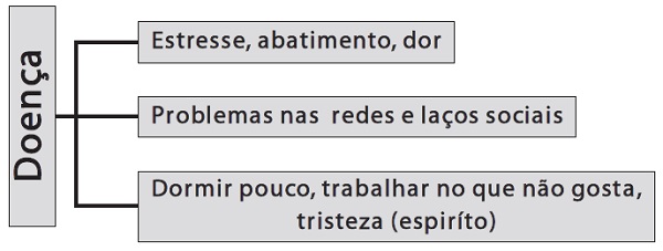 Ao mesmo tempo, mediante expressões-chave, os docentes demonstram ainda que a saúde tem a ver com uma negação da doença à qual Lefévre e Lefévre (2004) denominam de negação da negação. Ou seja, eu nego a doença porque não tenho como cuidar melhor do problema além daquilo que vivo neste meu momento da vida; portanto, tento obter compensações tendo um olhar positivo que nega de certa forma a ‘racionalidade’ médica dos problemas de saúde que o diagnóstico oferece como resposta aos sintomas que carrego em meu cotidiano. Sobre a categoria ‘doença’, percebem-se os elementos elencados na Figura 2.