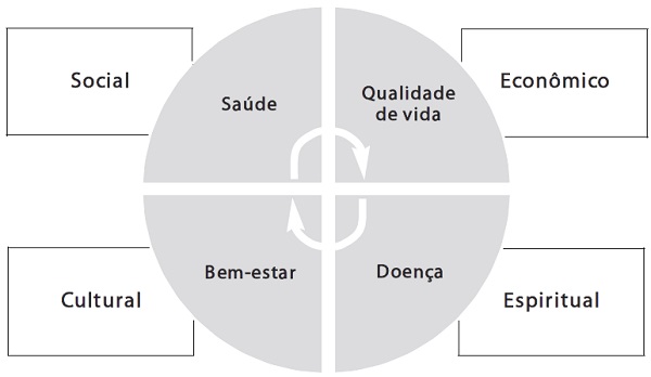Nesta análise, salienta-se a relação existente entre bem-estar e qualidade de vida e a sua vinculação direta com o que se concebe como saúde ou como doença, segundo as falas individuais e do grupo, revelando que todos os conceitos são emitidos considerando as perspectivas social, econômica, cultural e espiritual, e demonstrando que o modo de organização da sociedade influencia os valores das pessoas, direciona suas buscas e oportuniza doenças (Helman, 2009), como vemos na Figura 3.