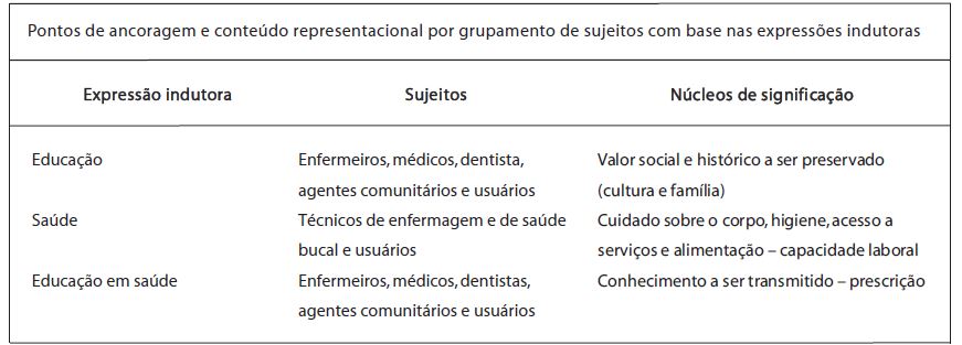 Dois aspectos foram relevantes na análise. O primeiro dizia respeito à identificação do que era consensual no grupo sobre educação em saúde; o segundo, à contextualização e descrição das práticas de educação em saúde realizadas pelas equipes nas unidades de ESF. A interação entre os dois aspectos permitiu depreender pontos de ancoragem das representações sociais acerca de educação em saúde.