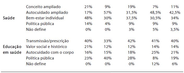 O conceito ampliado de saúde apareceu ainda de forma difusa, embora estivesse cada vez mais presente nos espaços formativos, em diretrizes curriculares na educação superior e na legislação e nas políticas de saúde mais recentes. A naturalização de saúde como bem-estar físico, emocional e social era ainda periférica nas referências socialmente construídas, entre os usuários ou por aqueles com a responsabilidade de promovê-la.