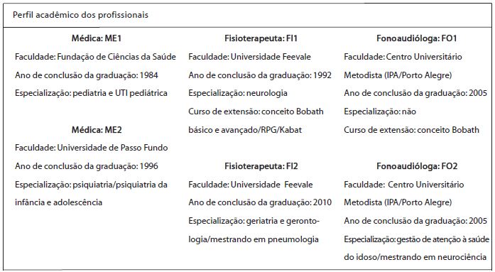 A fim de manter o sigilo dos entrevistados, os autores adotaram siglas — médico, ME; fonoaudiólogo, FO; e fisioterapeuta, FI — e números para identificá-los.