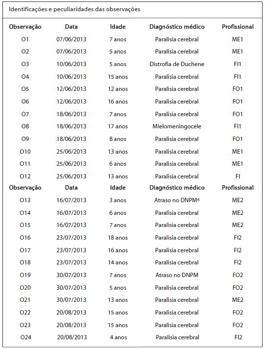 Também foram realizadas observações das atuações desses profissionais em atendimentos a pacientes com deficiência física, cuja descrição se fez por meio de um diário de campo baseado em um roteiro, levando em consideração situações relacionadas à inclusão social e ao atendimento humanizado, como as orientações e, se houvesse, os questionamentos e/ou abordagens efetuadas sobre essas temáticas. Observaram-se quatro atendimentos de cada profissional para pacientes que apresentassem algum tipo de deficiência física, associada ou não à deficiência intelectual, não importando a idade e o sexo. A observação foi individual e não participante. O pesquisador fez contato com o profissional e o paciente em atendimento, mas não participou ativamente da consulta (Ferreira, 2011).
