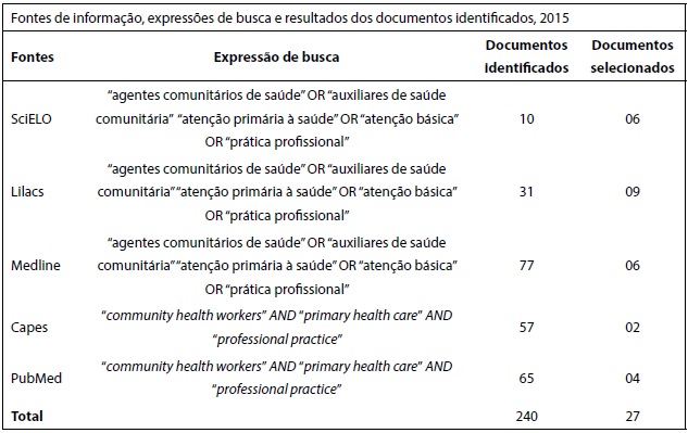 O estudo que deu origem a este artigo propôs-se a fazer uma revisão integrativa de literatura, com base em ampla análise de publicações, para obter dados e conclusões sobre determinada temática (Polit, Beck e Hungler, 2011). Realizou-se em seis passos (Mendes et al., 2008), começando pela demarcação das questões norteadoras: quais atividades realizadas pelos ACSs na APS no Brasil e no mundo? Qual sua inserção no trabalho em saúde? Depois selecionaram-se descritores no vocabulário controlado de descritores em ciências da saúde (DeCSs), utilizados de forma isolada ou combinada na estratégia de busca (Quadro 1).