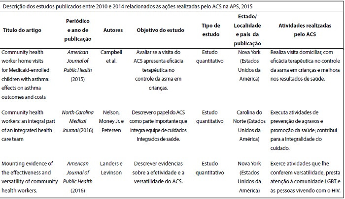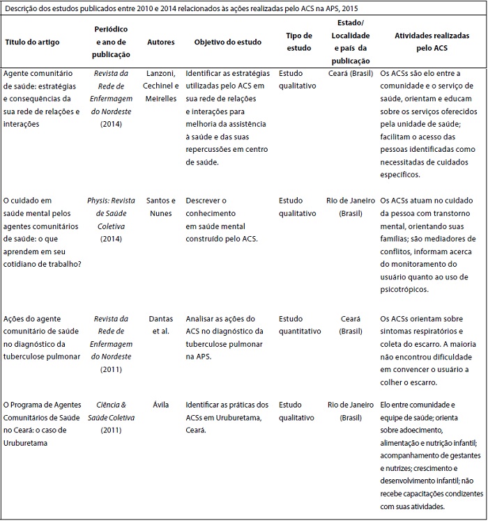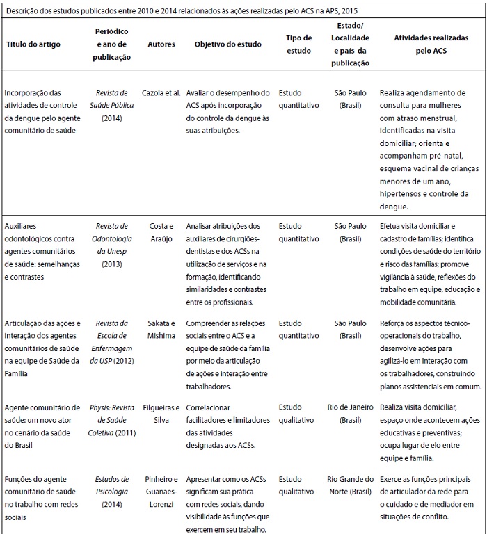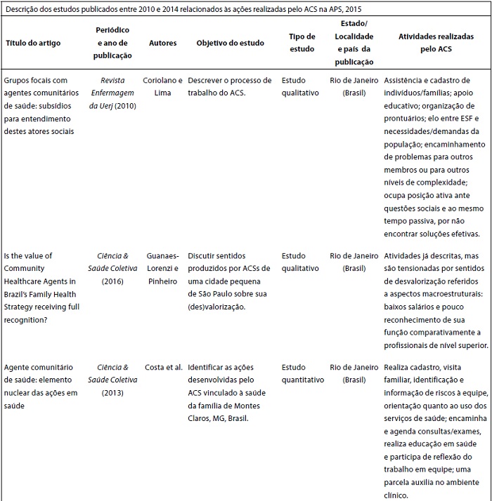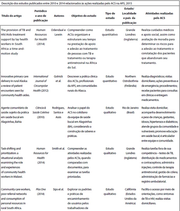 Concluem os estudos nacionais que o ACS é elo entre comunidade e ESF no monitoramento de casos e resultados de intervenções; facilita o acesso à unidade; cadastra famílias e identifica situações de risco; visita domicílios; encaminha para consultas; promove vigilância e ações de educação em saúde; reflete sobre trabalho e mobilidade comunitária; realiza atividades com grupos prioritários e ações para agilizar o trabalho. Também descrevem a inserção do ACS no mercado de trabalho. Tais publicações mostram o papel preponderante do ACS como elo entre comunidade e equipe de saúde, repassando-lhe suas condições de saúde, demandas e ofertas de cuidado com base nas necessidades dos usuários, além de facilitar o acesso daqueles que precisam de atendimento (Costa e Araújo, 2013; Sakata e Mishima, 2012; Filgueiras e Silva, 2011; Silva et al., 2012; Lanzoni, Cechinel e Meirelles, 2014; Santos e Nunes, 2014; Ávila, 2011, Rodrigues, Santos e Assis, 2010).