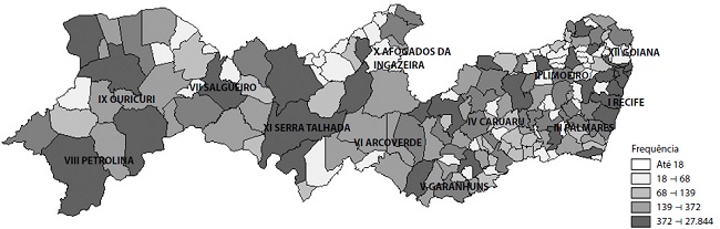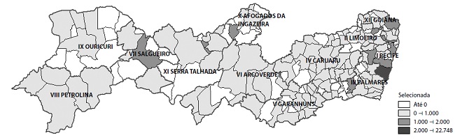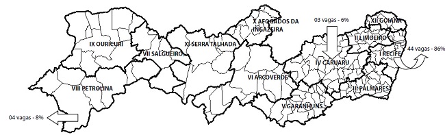 A distribuição dessas vagas de formação para especialista em ginecologia/obstetrícia no estado de Pernambuco se apresentou com grande concentração em uma única região de saúde (I Região) e na cidade de Recife. Até 2015, essas vagas estavam concentradas em Recife e Petrolina (I e VIII regiões de saúde). A partir do processo seletivo para preenchimento das vagas em 2016, houve uma expansão de três vagas em Caruaru; dessa forma, as vagas ainda estão concentradas em apenas três regiões de saúde do estado, I, IV e VIII (Recife, Caruaru e Petrolina), correspondentes às sedes de macrorregiões mais antigas do estado. Logo, a distribuição das 51 vagas de formação do programa de residência médica em ginecologia/obstetrícia para 2016 no estado de PE foram assim distribuídas: pouco mais de 6% das vagas em Caruaru, 8% em Petrolina e as demais 44 vagas, a maioria, 86% em Recife, como demonstra o Mapa 1. Esse fator demonstra uma concentração de formação dessa especialidade financiada pela gestão pública em Recife, uma tímida formação no agreste e vazio dela ao longo do estado, com mínima formação também a 712 quilômetros da capital, na cidade de Petrolina (Mapa 1).
