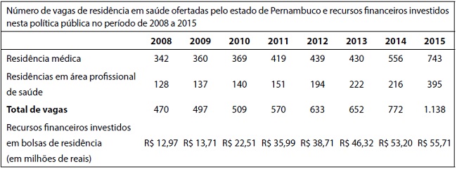 Ao longo dos anos, Pernambuco aumentou o número de vagas e, consequentemente, o investimento financeiro para formação de recursos humanos para o SUS/PE por meio do programa de residência em saúde, o que demonstra que esta é uma política pública de relevância para o estado (Quadro 1).
