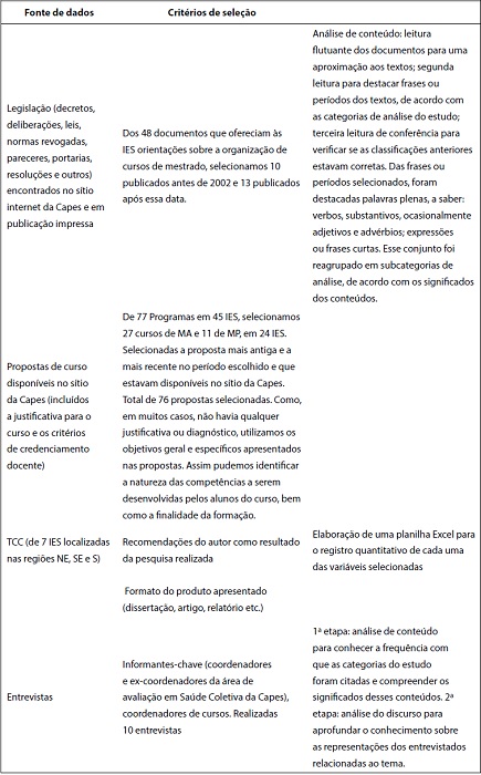 Dentre os 48 documentos que ofereciam às Instituições de Ensino Superior (IES) orientações sobre a organização de cursos de mestrado, selecionamos 10 publicados antes de 2002 e 13 publicados após essa data. Dos 77 Programas de Saúde Coletiva credenciados na Capes, pertencentes a 45 IES, selecionamos os cursos com base nos seguintes critérios: em funcionamento entre 2002 e 2012, com TCC a partir de 2004; submetidos a duas avaliações da Capes; e não descredenciados no período. A seleção final constou de 27 cursos de MA e 11 de MP em 24 IES. Em seguida, selecionamos as propostas de curso mais antiga e mais recente no período escolhido e que estavam disponíveis no sítio da Capes, perfazendo o total de 76 propostas selecionadas. Como em muitas propostas não havia qualquer justificativa ou diagnóstico, utilizamos os objetivos geral e específicos nelas apresentados. Assim pudemos identificar a natureza das competências a serem desenvolvidas pelos alunos do curso, bem como a finalidade da formação.