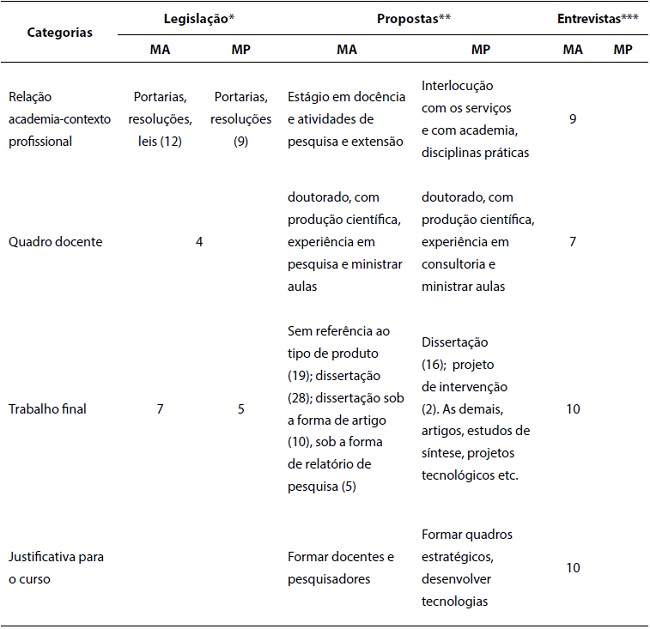 Com o objetivo de aprofundar a compreensão sobre o tema e suas inter-relações, analisamos5 as semelhanças e diferenças da relação teoria-prática no MA e no MP, adotando as seguintes categorias empíricas: relação academia-contexto profissional, quadro docente, trabalho final e justificativa do curso. Cada categoria foi assim definida: (a) relação academia-contexto profissional (fundamentos da relação que os cursos pretendiam estabelecer entre o mundo acadêmico e o mundo do trabalho, e de que maneira a dimensão prática foi considerada nas propostas de MA e MP); (b) quadro docente (critérios para inclusão de docentes e orientadores nos cursos de MP e MA); (c) trabalho final (tipo de produtos valorizados e recomendações feitas nos trabalhos de conclusão de curso - TCC); (d) justificativa para o curso (diagnóstico que justificasse a existência do curso).