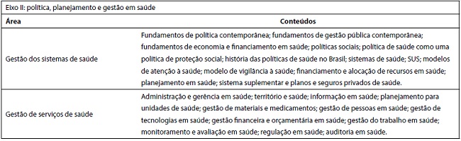 No que concerne à caracterização dos conteúdos referentes à gestão de sistemas de saúde, pôde-se identificar nas matrizes curriculares a ausência de conteúdos sobre ‘fundamentos de política contemporânea’, ‘fundamentos da gestão pública contemporânea’ e ‘fundamentos de economia e financiamento em saúde’. A inexistência desses conteúdos nos cursos de graduação em saúde coletiva pode ser considerada um problema, pois a compreensão da categoria política em sua polissemia e sua intrínseca relação com o poder econômico ( Pio e Porto, 1998 ) e com a administração estatal (em suas múltiplas vertentes) ( Secchi, 2009 ) são cruciais para a construção do conhecimento nessa área.
