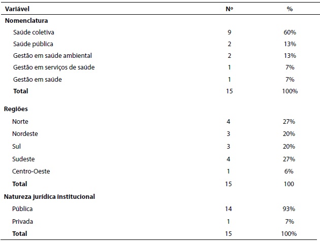 Em consulta ao banco de dados no site do e-MEC, foram encontrados 18 cursos de graduação em saúde coletiva no Brasil ali registrados. Dos 18, 15 disponibilizavam suas grades curriculares em sítios eletrônicos na internet, isto é, as informações coletadas e apresentadas na pesquisa representaram 83,3% das graduações citadas antes. Em relação à nomenclatura adotada pelos cursos, as graduações com denominação saúde coletiva representaram 60% (9) do total. Os outros nomes identificados foram saúde pública: 13% (2); gestão em saúde ambiental: 13% (2); gestão em serviços de saúde: 7% (1); e gestão em saúde: 7% (1).