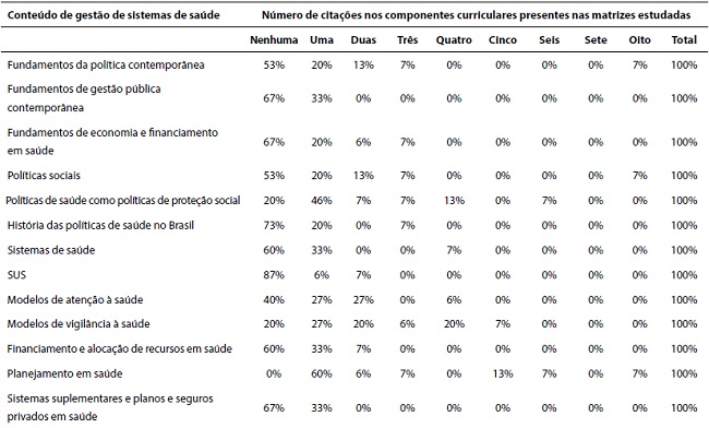 Em 60% (9) das matrizes curriculares estudadas, não foram identificados conteúdos sobre o componente curricular ‘gestão de pessoas em saúde’; sobre as que apresentaram, as proporções foram as seguintes: pelo menos uma vez (27%; 4), duas vezes (6%; 1) e quatro vezes (7%; 1). Conteúdos sobre ‘gestão de tecnologias em saúde’ não foram identificados em 67% (10) das matrizes curriculares pesquisadas; nos 33% das vezes em que foi citado, variou nas seguintes porcentagens: uma vez (6%), duas vezes (13%), três vezes (7%) e quatro vezes (7%).