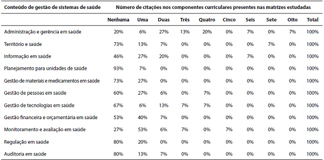 ‘Administração e gerência em saúde’ é um conteúdo que 80% das matrizes apresentaram em sua constituição, citando-o pelo menos uma vez (6%; 1), duas vezes (27%; 4), três (13%; 2), quatro vezes (20%; 3), seis (7%; 1) e oito vezes (7%; 1). Sobre o conteúdo relacionado a ‘território e saúde’, 73% (11) das matrizes curriculares não citaram esses conteúdos em sua composição; em 27% das vezes em que se mencionou esse conteúdo, ele foi identificado nas seguintes porcentagens: uma vez (13%; 2), duas vezes (7%; 1) e sete vezes (7%; 1). Quanto aos conteúdos sobre ‘informação em saúde’, 46% (7) não foram citados nas matrizes curriculares; em 54% das vezes em que o conteúdo foi mencionado, identificou-se nas seguintes proporções: pelo menos uma vez: 27%; duas vezes: 20%; e seis vezes: 7%.