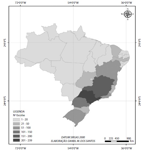 A busca identificou as escolas que oferecem ensino presencial e ensino a distância (EAD); e em atividade ou em processo de extinção (quando o curso não possui novos processos seletivos para ingresso) ou extintos. As informações foram coletadas no mês de maio de 2015 e relacionados o número de vagas e a distribuição de escolas, conforme estimativa populacional realizada pelo Instituto Brasileiro de Geografia e Estatística (IBGE).