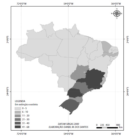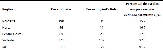 No tocante ao registro das escolas, dos 1.121 identificados, 28,9% estão em processo de extinção ou já foram extintos ( Figura 2 ), sobressaindo os estados do Paraná e Minas Gerais com 56,7% e 44,1%, respectivamente.