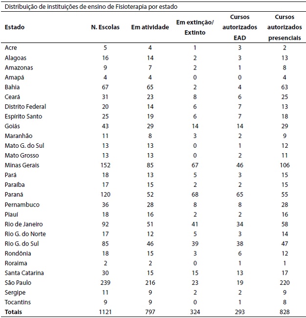 Abstract: The incredible growth in the number of Physical Therapy schools in Brazil needs to be analyzed. There was a 476 percent increase in the number of courses located in major cities and in private educational institutions between 1995 and 2008. Aiming to analyze the distribution of Physical Therapy schools in the different Brazilian regions, identifying the institutions offering presence and distance education, a quantitative, exploratory, and cross-sectional study was carried out based on secondary data collected from the e-MEC site in 2015. The number of openings and school distribution were listed based on population estimates. Physiotherapy courses are concentrated in large cities, making it difficult for the population in the interior to have access to them. The highest concentration is in the states of São Paulo (239 courses), Minas Gerais (152 courses), and Paraná (120 courses), where most professionals are also located. Course distribution analysis identified the need to invest in opening courses in Northern Brazil. The unbridled growth of Physical Therapy schools, coupled with the lack of criteria for opening new courses in the country, reiterates inequalities in the distribution of professionals.