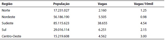A análise de proporção de vagas por habitantes revela uma realidade brasileira. Taneguti (2012) destaca que, mesmo com as políticas de incentivo para criação de vagas no ensino superior, o acesso é privilégio de uma minoria e, segundo a autora, menos de 5% da população teve acesso às IES. Apesar do aumento significativo no número de escolas, a taxa de escolarização de pessoas entre 18 e 24 anos é considerada um problema. Em 2010, a média de estudantes no ensino superior foi de 13,6% no Brasil. Na região Sul, 20% dos jovens estão no ensino superior, enquanto nas regiões Norte e Nordeste este índice é de 9,9%. Em relação ao número de vagas, Haddad et al. (2010) analisaram a distribuição de vagas de 14 cursos da área da saúde, cujos resultados corroboraram os dados encontrados neste trabalho, onde 57% dos concluintes dos cursos da área da saúde estavam na região Sudeste do Brasil.