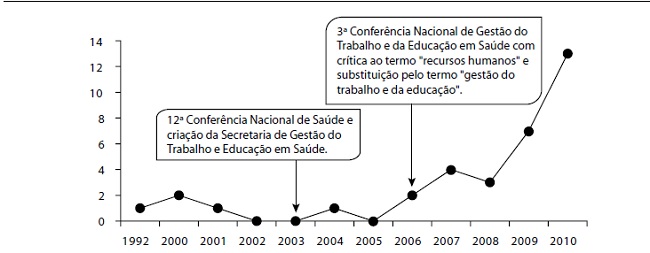 Em março de 2006, ocorreu o terceiro encontro nacional para discutir o tema ‘recursos humanos em saúde’, porém, houve mudança em seu nome, passando a ser denominado 3a Conferência Nacional de Gestão do Trabalho e da Educação em Saúde (CNGTES). A crítica ao termo ‘recursos humanos’ foi reforçada nessa conferência, principalmente pelo então secretário da Secretaria de Gestão do Trabalho e da Educação em Saúde e coordenador da conferência, Francisco Eduardo Campos: “Os trabalhadores da saúde não são um insumo adicional que se agrega aos recursos financeiros, tecnológicos e de infraestrutura para produzir serviços: são os próprios serviços de saúde” ( Dominguez, 2006 , p. 8). Como resultado, a expressão ‘recursos humanos’ foi substituída definitivamente no nome da conferência e em todos os seus documentos por ‘gestão do trabalho e da educação’.