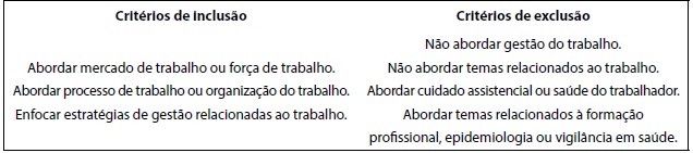 Para identificar os estudos relevantes foram utilizados os descritores ‘gestão em saúde’, ‘administração em saúde’ e ‘trabalho’, aplicados em busca na base de dados da Literatura Latino-americana e do Caribe em Ciências da Saúde (Lilacs), utilizando-se a seguinte composição: (gestão OR administração) AND (trabalho AND (saúde OR (serviços AND saúde))), filtrando por [palavras do título] OR [palavras do resumo] AND NOT teses [tipo de literatura]. O descritor ‘gestão do trabalho’ não foi localizado na taxonomia DeCS (Descritores em Ciências da Saúde). Foi considerado um período de 20 anos, escolhido com base no primeiro registro do uso da expressão (1991), por isso, a análise foi realizada entre 1990 e 2010.