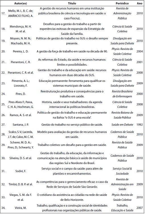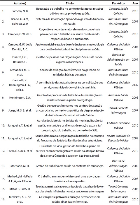 Os artigos apresentaram 705 referências diferentes, sendo 155 documentos oficiais (publicações da Organização Mundial da Saúde (OMS), Organização Pan-Americana de Saúde (Opas), dos ministérios, secretarias estaduais e municipais, leis e portarias, entre outros) com destaque para 81 publicações do MS (52%), incluindo publicações da SGTES, Constituição da República Federativa do Brasil de 1.988 e os Princípios e Diretrizes para a Gestão do Trabalho no SUS (Norma Operacional Básica de Recursos Humanos – NOB/RH-SUS).