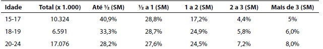 Acreditamos ser importante trazer informações relativas ao perfil econômico da juventude brasileira, pois será constatado que a condição económica não só é um dos determinantes do processo de escolarização, mas define, talvez de forma mais contundente, a forma de inserção no mercado de trabalho. Vejamos a Tabela 1.